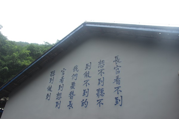 队员们来到渣滓洞的看守所,可以看到这里分为内外两院。内院墙上写着“青春一去不复还,细细想想”、“认明此时与此地,切莫执迷”、“迷津无边,回头是岸”、“宁静忍耐,毋怨毋忧”反动标语,讲解员告诉队员们这是国民党特务为了从精神上瓦解革命者的斗志。