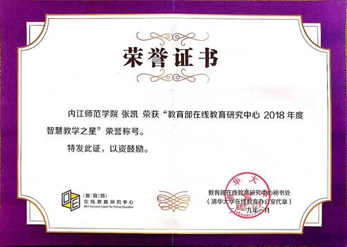 为推进信息技术与教育的深度融合,表彰在智慧教学创新模式的探索和应用方面有突出贡献的优秀教师,2018年11月,教育部在线教育研究中心开展了2018年度“智慧教学之星”荣誉称号的评选工作。经评审专家评议,公司计科公司张凯教授被评为“智慧教学之星”,这是公司运用先进的信息技术进行教学,积极推动“智慧教学”,认真贯彻落实党的十九大精神和全国教育大会精神、加快推进教育现代化取得的成绩之一。