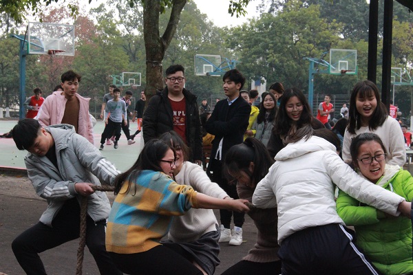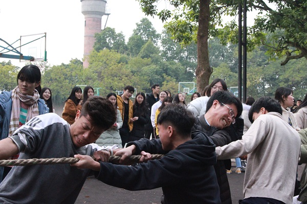 尽管已到冬至,天气有些寒冷,但前来加油助威的同学仍不在少数,使得赛场氛围十分热烈。当比赛的哨声响起,只见参赛的同学们紧握长绳,团结一心,卯足了劲拼命往后拉,观赛同学在旁边也自发组成啦啦队为自己班的同学高喊 “加油”,呐喊声响彻云霄,整个场面既激励又温馨 。