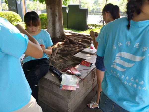 下午3点,实践队在师院东区篮球场集合,带着征兵宣传所需要的东西前往大千园,进行宣传摆点。志愿者们不畏高温炎热,进行着征兵宣传的准备工作。由于下午天气炎热,外出的人很少。志愿者们耐心的等待,有人路过就为其介绍征兵的相关知识、讲述应征入伍的好处,积极鼓励其参军。