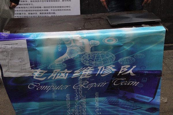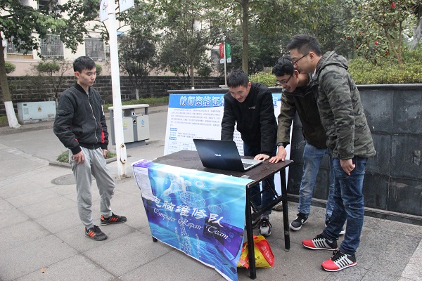 寒冷的天气,天空中还飘着绵绵细雨,但这并没有熄灭电脑维修队队员为大家服务的激情。“在周末玩耍,还不如做一点有意义的事”,队里的一位同学说道。在多数同学都去玩儿的情况下,电脑维修队的同学们却依然坚持留校为那些需要帮助的人服务。“我的电脑开机的时候总是在更新系统,迟迟开不了机?”“我电脑中毒了,能帮忙修下吗?”此时来自义务维修队的队员们正在为前来咨询的同学热情解答电脑问题。从早上八点到下午五点,义务维修点不断有同学前来维修电脑和咨询电脑使用过程中遇到的各种问题。队员们除了在维修点维修之外还派出一个队员上门为同学们维修电脑。队员们帮助大部分同学解决了网速慢、网页打不开等问题,还提供了给电脑机箱除尘,风扇加油、重新安装系统、电脑软硬件维修、计算机知识咨询等服务,并获得了同学们的鼓励和支持。