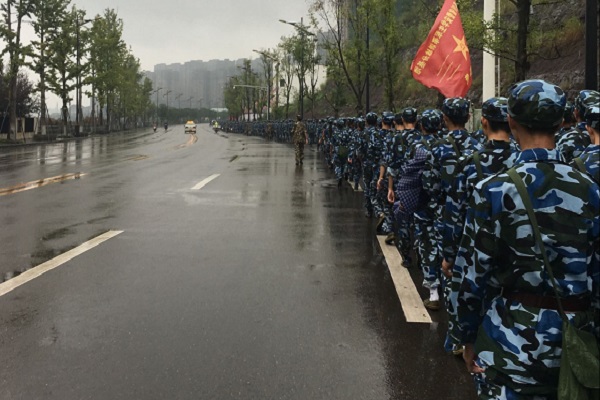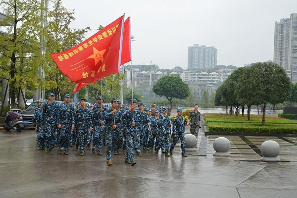 行军途中,旗帜在细雨中随风高高地扬起,每一个新生穿上迷彩,接受一份半军人的洗礼。在行进过程中,士气高昂,意志坚定,充分体现了前期军事训练的成效。途中进行了传歌活动,歌声慷慨激昂,整支队伍健步如飞,气势如虹。近四百人的队列无一人掉队,无一人放弃,仿佛就在一个小时的行军拉练中,瞬间成长为真正的老员工。