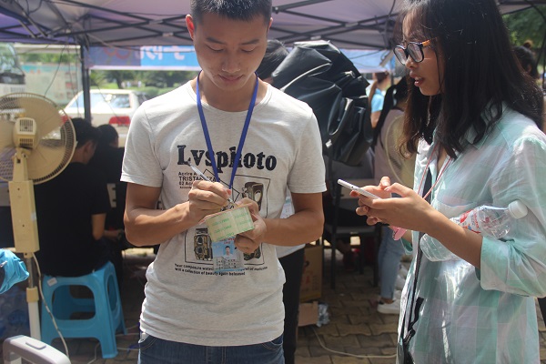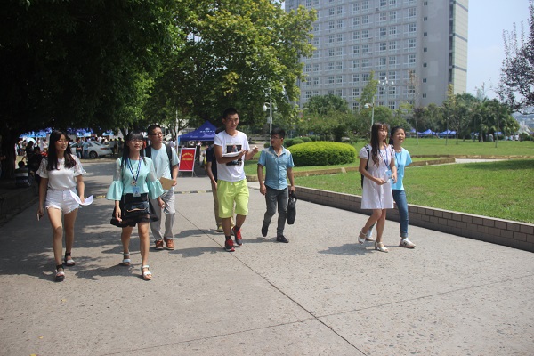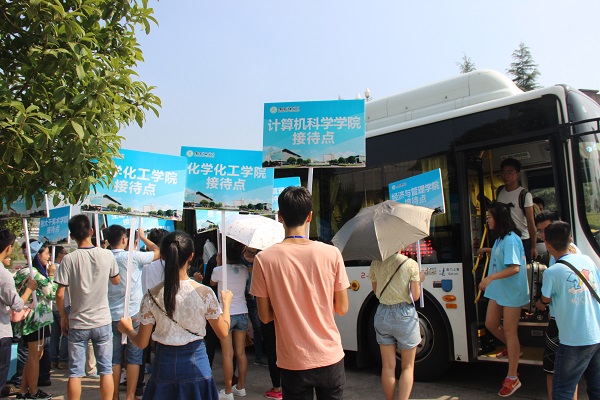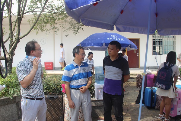 在天一广场,音乐楼前设立的接待点,新生和家长一到点,众多的迎新志愿者马上微笑着迎上去:“你好”,“欢迎来到太阳成集团tyc33455cc计算机科学公司”,并“抢”下新生和家长手中沉重的行李。炎炎夏日,公司党总支书记徐大军,经理刘益和来到迎新现场安排工作,亲力亲为的工作态度为我们树立了良好的榜样。