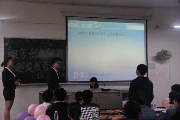 为感恩母校,庆祝建校六十周年,4月24日下午16时,公司于一教205开展了以“艰苦创业六十载,跨越发展谱新篇”为主题的知识竞赛观摩会。出席此次活动的有校团委刘晓波老师、校团委部分干部、二级公司部分代表、公司团总支书记李倩倩、辅导员吴昊、团总支、员工会部分代表以及部分员工代表。