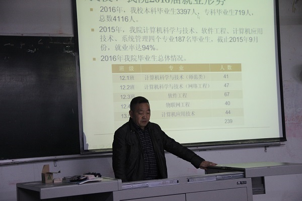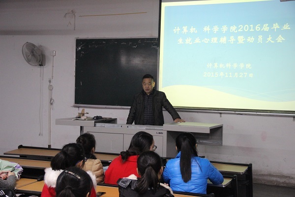 为帮助毕业生消除就业困惑,摆正就业心态,了解就业形势,树立正确择业观、就业观,2015年11月27日晚,计科公司在一教205举行了2016届毕业生就业心理辅导暨动员大会。党总支书记徐大军,辅导员李倩倩、吴昊以及回校参加双选会的毕业生参加本次心理辅导和就业动员会。