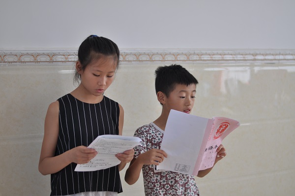慢慢的,孩子们陆续来到教室,今天是两个村的孩子首次在一个教室里观看2015年暑期三下乡的文艺汇演,也是和万古乡的孩子在一起的最后一天。上午九点,文艺汇演正式开始,首先是侯玉可小朋友和杨方毅小朋友作为主持人致开幕词,他们童真的声音让大家一下子进去了状态。随后孩子们又表演了舞蹈《小苹果》,歌曲《虫儿飞》,诗歌朗诵《送别》等等,其中大家印象最深刻的孩子们孩子们在一起表演的手语舞《感恩的心》,他们整齐的动作,深情的演唱让志愿者们为之动容,紧接着,志愿者张雪也为小朋友们带来了好看的健美操表演,受到了小朋友们的喜欢。上午10点30分,文艺汇演结束,志愿者们和小朋友们在一起交换了联系电话和地址,并纷纷拍照留念。很多孩子因为舍不得志愿者离去流下了眼泪,志愿者们纷纷安慰可爱的孩子们。