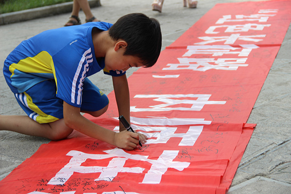 在遵义纪念公园内,队员们积极主动地与市民进行交谈,询问他们对红色文化的记忆与了解,探寻他们对革命精神的独特体会。一位老爷爷满怀感激之情地说道“我对共产党是很感谢、崇拜的,父母养育了我,共产党把我培育成人”。在随后的横幅签名活动上,我队邀请市民们与我们交流他们的想法,并在横幅上写下他们的话语与姓名,这得到了市民们的大力支持。鲜红的横幅上,是一行纯白的大字“红色长征路,内师在黔行”,而在此刻,上面写满了的遵义淳朴市民们的寄语,都包含着他们心中的共同呼声:不忘历史。通过这个活动,引起了大家对红色文化的重视,让更多的人来宣传红色文化,传播正能量。