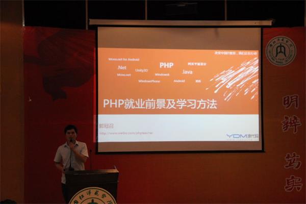 会议第二项,主讲人郭冠召首先播放了公司毕业现已工作的师兄师姐录制的视频。师兄师姐们主要介绍现在自身的工作性质、工作待遇、工作环境,以及在“源代码”公司的学习内容等等。之后,郭冠召以PPT的形式展开交流。主要从以下展开:PHP的就业前景、PHP的学习方法、当前互联网环境的现状、软件公司的现状、PHP的作用体现。在PHP的就业前景方面,郭冠召从当今企业需求量——前端语言的对比,以实际的数据来说明,当前的PHP、C++、JAVA等语言在各个公司企业的占用比例;其二,在互联网公司与软件公司的异同中,主要就当前国内知名品牌的企业,如“腾讯、百度、京东”等,其中,郭冠召着重讲了现在成都天府软件园入住的企业,“陌陌、华为、阿里巴巴”等知名单位以及从事软件与网络的大公司:阿里巴巴、小米在近两年的迅速发展状况,为同学们掌握好专业技能,找到一份满意工作助长了信心。
