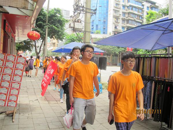 在经过半小时的奔波后,队伍抵达资中车站。下车后又马不停蹄的赶向我们今天的目的地——重龙山镇文庙社区 。此刻正值烈日,太阳像个大火球炙烤大地,阳光灼烧皮肤,但是却没有一个队员抱怨。到达重龙山镇文庙社区后,更出乎意料的是,我们得到了社区阿姨的热情接待,帮我们寻找挂横幅的地方,帮我们寻找摆点用的桌椅。本以为阿姨会说我们没有时间观念,来的太晚了,可阿姨没有表现出丝毫不满,还一直帮我们弄东西,还直言:“和你们在一起,感觉自己都年轻了”。阿姨的热情,让我们的内心感动不已。尽管太阳很大,队员们还是顶着烈日,在商铺,在马路上发放宣传单,宣传着我们的活动。