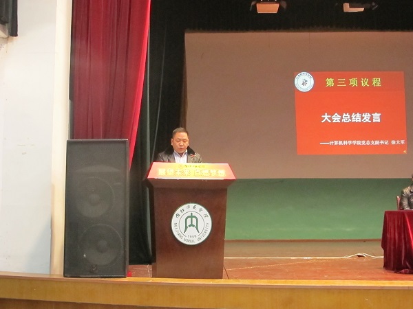 大会最后,计科公司党总支副书记徐大军对本次会议进行了总结,提出了“诚信是立身之本”,“制度是行为的准则”,“勤奋是成功的基础”等五点建议,并鼓励同学们认真备考,诚信考试,并预祝同学们考出好成绩,欢欢喜喜回家过年。