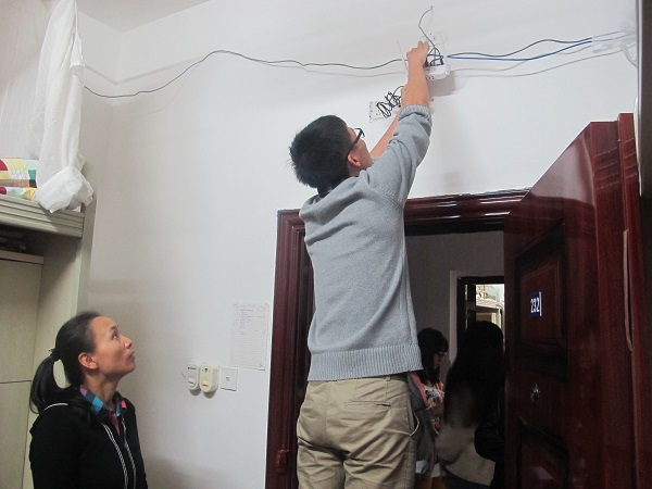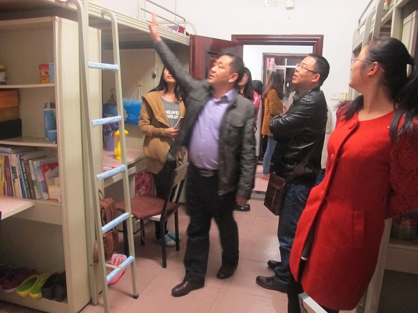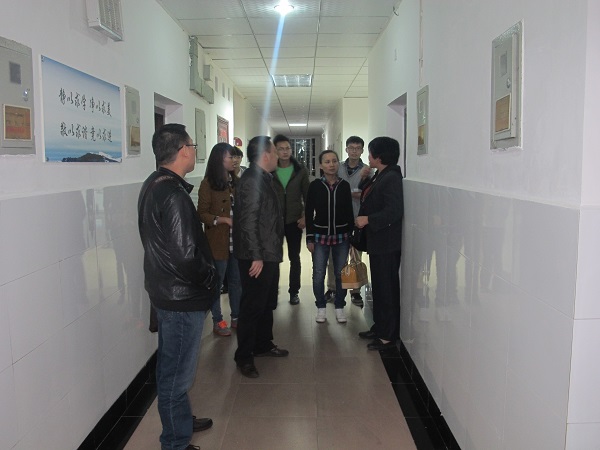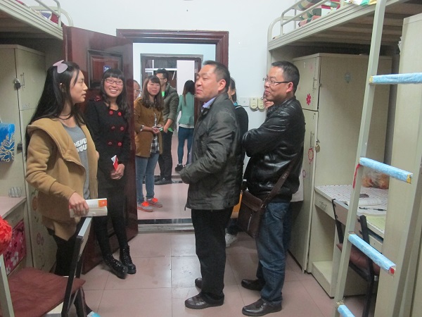 来到了寝室,徐书记和老师们就申报“2013年省高校标准化员工公寓”的标准对寝室内务整理进行了指导。来到寝室,所到之处都是一片融洽的气氛,同学们向书记和老师问好,书记和老师们也都回以微笑。老师们对同学们在寝室内务上做的好的地方不吝赞美,并鼓励同学们继续保持;对不足之处也细心指出并给予建议;对于员工的人身安全,徐书记也很关心,还强调了一些注意事项,包括寝室用电安全、寝室网线牵引等。徐书记在关心内务的同时,也提醒同学们要早睡早起,最近天气转凉,希望注意添加衣服,预防感冒。