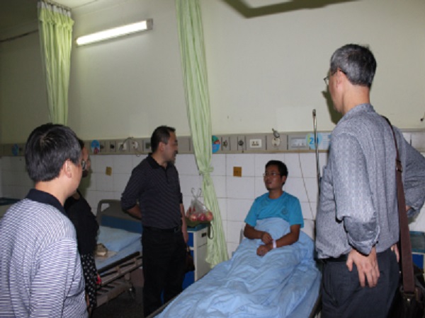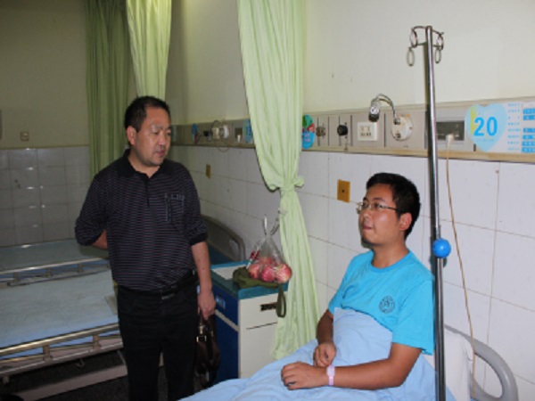 9月9日下午2:50,是下午军训集合开始训练的时间,大一新生白科同学由于起床较晚,慌忙间从上铺下床时脚下踩空,导致腰部软组织挫伤。计科领导在接到消息之后急忙赶到医院看望受伤的同学。