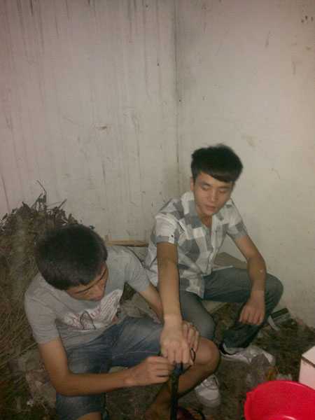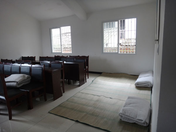 下午活动结束后,他们拖着疲惫的身子回红草村,男生们在村公社办公室(即是临时教室又是他们的寝室)搬桌动椅腾空间。把两排椅子相对拼在一起做成“床”,捡三张席子平摊在一方地上加三床棉絮就是他们今晚的“栖息地”。在这里没有宽大的床,没有柔软的枕头,没有香香的被子,但是没有一个在抱怨,没有一个在叫苦,没有一个说后悔!