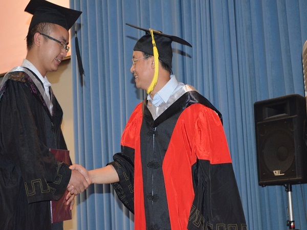 典礼一共分为三部分。在主持人宣布典礼正式开始之后,典礼进入第一项议程,在场人员全体起立共唱国歌。在第二项议程中,刘经理亲自向获得学士学位的毕业生授予学位,细心地为每个上台领取证书的同学拨穗正冠,并亲切握手。紧接着是领导以及员工代表致辞,刘经理首先表达了对即将走入社会的毕业生所寄予的厚望,嘱咐各位即将走出校门的学子要志存高远,持之以恒,以实现祖国繁荣昌盛为己任,在将来的岗位上做出自己的贡献,为中国梦的实现贡献出自己的一份力量。毕业生代表涂博表示所有的毕业生一定不会辜负公司领导的期望,一定会做好带头作用,为还在公司学习的师弟师妹们树立好榜样。在校生代表李远平也表示在校的同学会珍惜学习时光,学好自己的专业,不会辜负师兄师姐们的厚望。