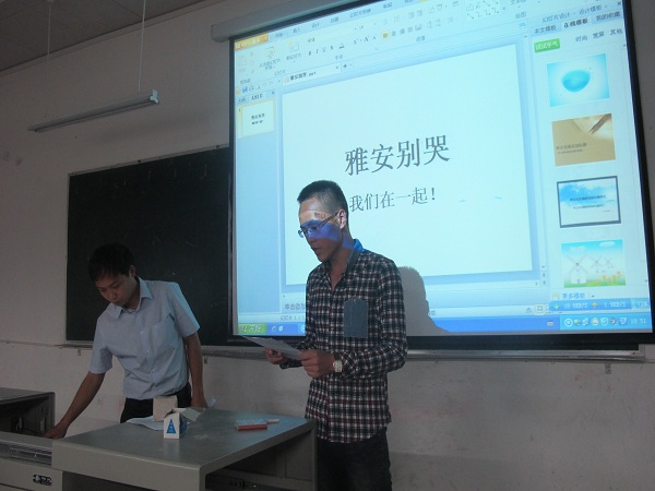 为深切缅怀雅安芦山地震遇难的同胞们以及对受灾的同胞传递我们共同的祝福,计科公司于4月21日晚召开了“祈福雅安”“雅安不哭,我们与你同在”等一系列的主题班会,辅导员吴昊老师参加了本次班会。
