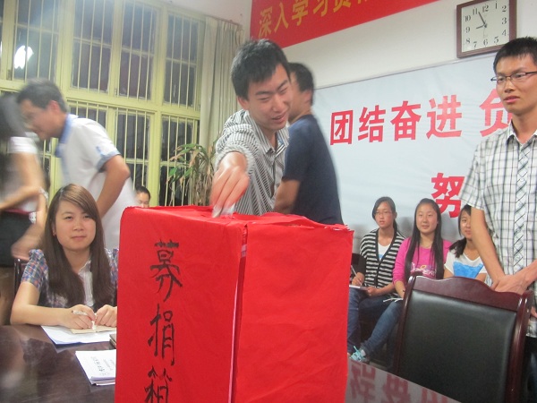 在募捐活动结束后,员工会主席蒲勇通知各班班长,在班上组织同学进行募捐活动,不论多与少,只要共献爱心,伸出援助之手,都能帮助灾区同胞重建美好家园。