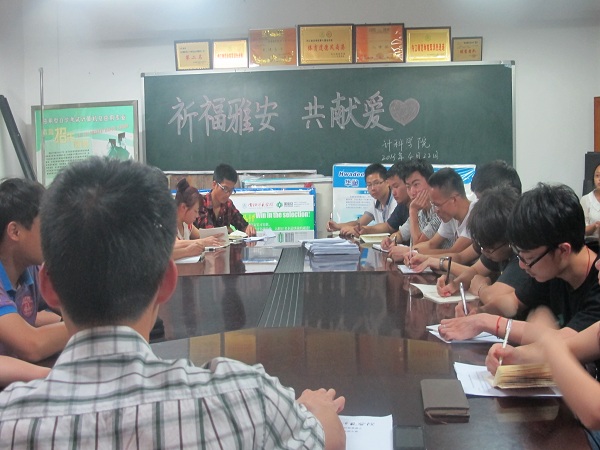 4月22日20点50 分,计算机科学公司在原系办会议室举行了祈福雅安共献爱心的募捐活动,参加本次活动的人分别有辅导员李倩倩老师、辅导员吴昊老师、员工会干部成员以及各班班长。