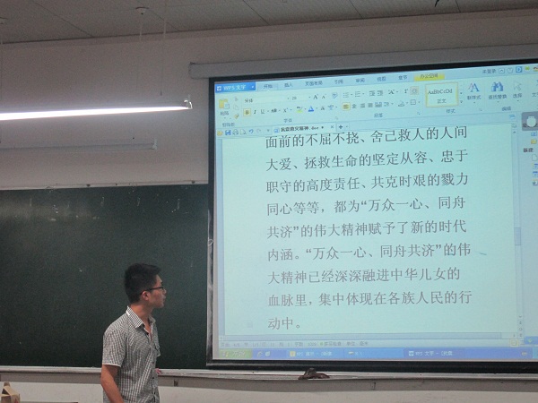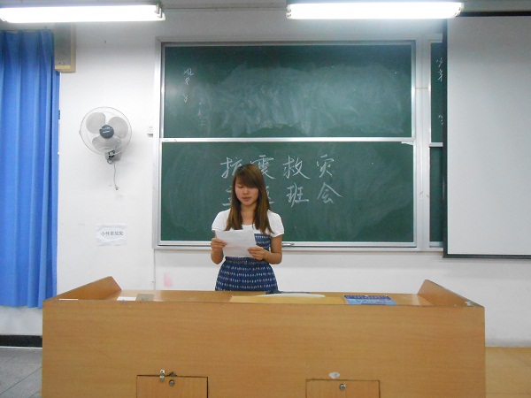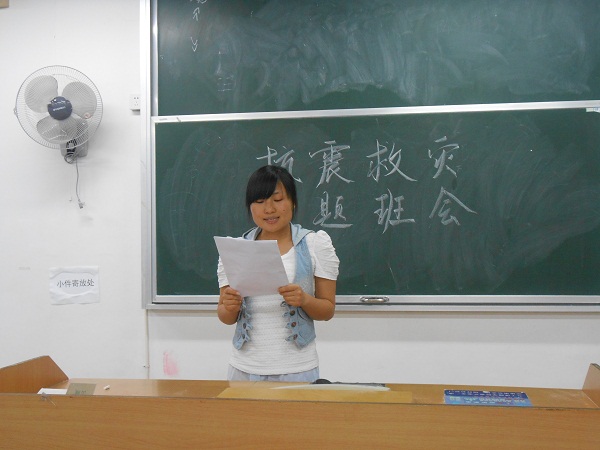 会上,各班班长以PPT的形式为同学们讲述了自唐山大地震以来中国所经历的各场地震灾难的情况以及中国人民在灾难面前患难与共、百折不挠、勇往直前的精神,更强调了“多难兴邦,多难励党”这一重要启示。各班灾区员工代表也分享了自己的遇震感受以及抗震经验。来自雅安的2012级4班同学孔毅说:“只要家没事,一切都会好。”一句普通的话语,道出了计科学子的坚强。接下来,孔毅详细地为同学们讲解了地震时在不同环境下应该如何逃生以及躲避等知识。