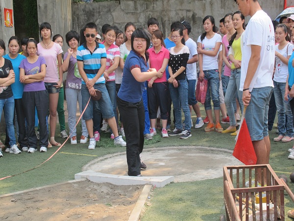 罗梦婷选手用右手紧握着铅球,保持手面与地面平行,伴随裁判员手中红旗挥动,利用腰部力量用力将铅球推出,黑圆的重球在空中呈现出一道优美的抛物线,而后在距离起始线5.36米处落地。在下一轮比赛中,她再接再厉,扔出5.7米。唐丽蓉选手英姿勃发,充满自信,手握铅球,在一声助喊之后将球抛出,取得了5.69米的好成绩。其他选手也拼尽了全力为公司争光。