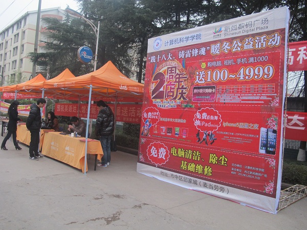为了给同学们排除计算机方面的故障,帮助同学们更加有效的维护电脑,计科公司携手新尚数码广场于12月24、25日10:00——17:00在新尚数码广场开展“践十八大,铸雷锋魂”暖冬公益活动,计科公司的员工倾力为前来咨询、维修的同学进行免费的电脑清理、除尘、系统重装等一系列维修以及基础知识的讲解。