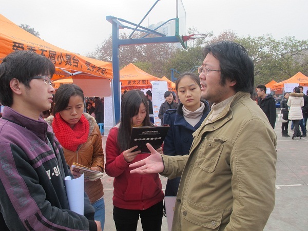此次双选会不仅吸引了众多的内师学子前来投递简历,我们还随处可见内江职院、西华师范大学、绵阳师院等四川省内部分高校的员工前来应聘。双选会也给10、11届的在校生提供了一个学习交流的平台,不少员工冒着早上的细雨,提前来到会场,掂量适合自己的岗位,思考着自己将来的方向。来自计科公司11级3班软件工程的苏岑,谈到他此次前来双选会的感受,他向记者说道,“我对软件开发有着浓厚的兴趣,平时没事就喜欢敲写代码,本次前来咨询了软件工程师所需技能,给我一个很确定的目标,很有收获。”