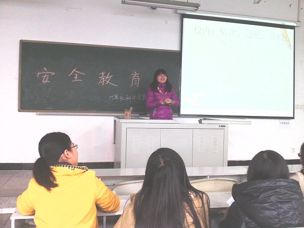 班会伊始,刘老师给同学们讲解了有关安全方面的知识。首先是校内应该注意的问题,主要是宿舍安全(火灾、偷窃、触电、中毒、打斗),刘老师强调在寝室不能使用大功率用电器,不能乱接电线线路,同时介绍了一些意外事故发生后的紧急处理方法。不做违纪、斗殴、不正当活动等。