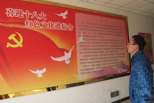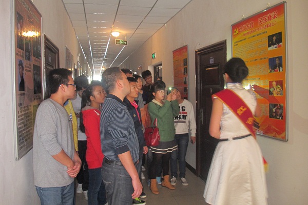 为了响应即将召开的党的十八大,并增强老员工同心同德的理念,10月31日15:00,计科公司总支副书记徐大军以及辅导员老师刘倩倩组织各班的新生代表近32人到13栋工程技术公司员工宿舍参观学习“红色文化”建设。