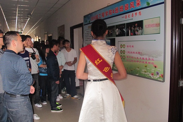 接下来,同学们在红色导游的带领下参观了示范寝室。干净,整洁的宿舍,散发着浓厚历史文化气息的装饰,连同一幅幅意气风发的毛笔作品,引得同学们频频赞叹与羡慕。无形之中激发了同学们对寝室装饰的热情。更使得计科老师和同学均发出“走进去就有一种赏心悦目的感觉”的慨叹!