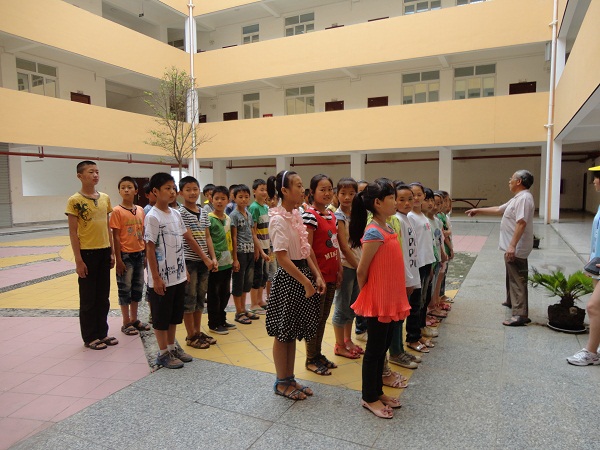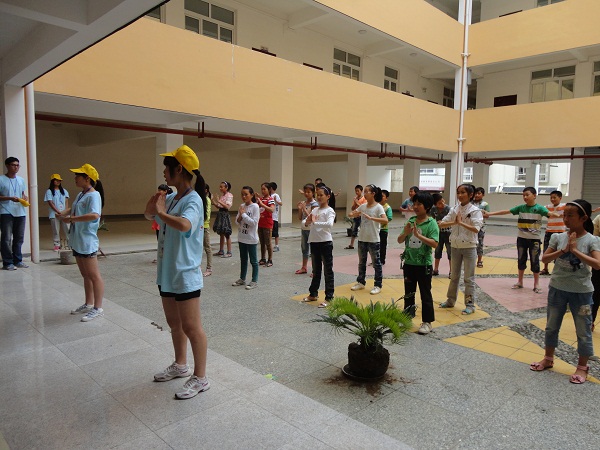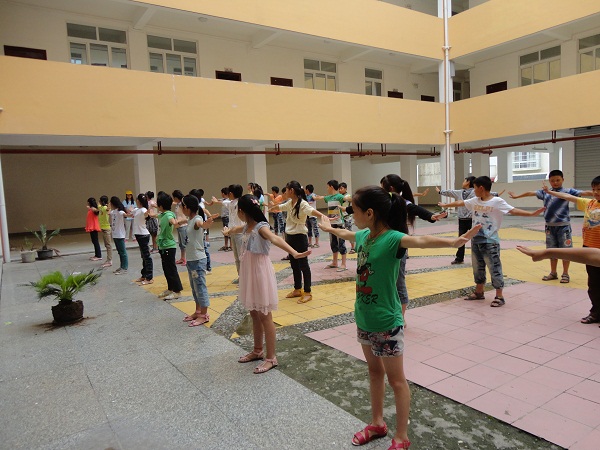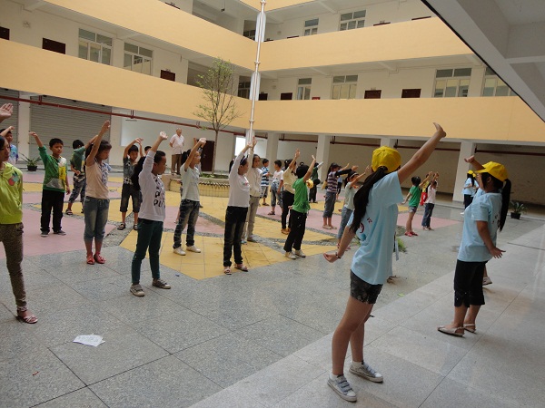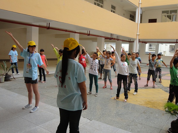7月21 日“感恩家乡、情定汉源”社会实践小分队所有队员又一次来到小学,今天我们与前几天不同的是与同学们一起在户外学习,也就是学习我们的“武术健身操”。