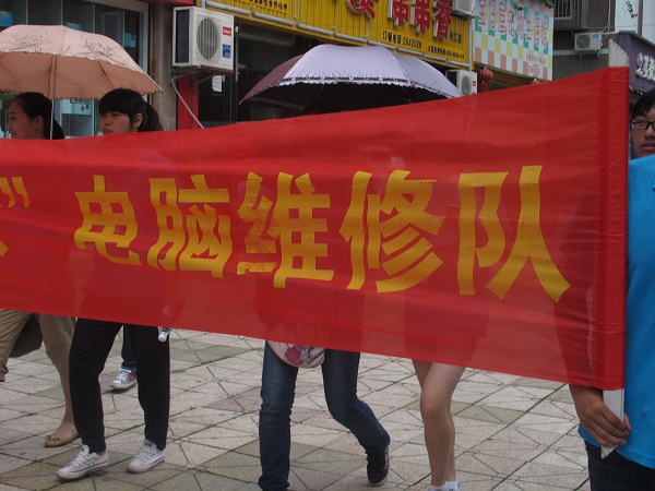 2012年7月15日,炎炎夏日,计算机科学公司暑期“三下乡”电脑义务维修队在指导老师徐大军书记带领下一行26人手拉横幅走在内江市广汇花园及各大街小巷里,帮居民们做免费的电脑维修、维护,宣传电脑使用知识。