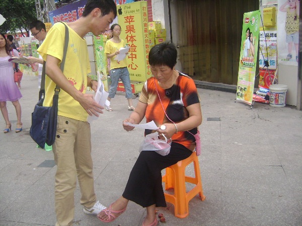 我们只好改变策略,专找一些看着很清闲的市民派传单。结果,有一组队员遇到前几天的一位熟人,就是给他念宣传资料的那位大爷,大爷和我们闲聊起来,然后还叫上一些他的老朋友过来听我们宣传,这些老人都很和蔼友善,在队友讲解期间也都非常认真,真的很感谢他们。还有一组队员遇到一个小型活动,很多人围观,然后队员们就借机开始宣传也达到了很好的效果。
