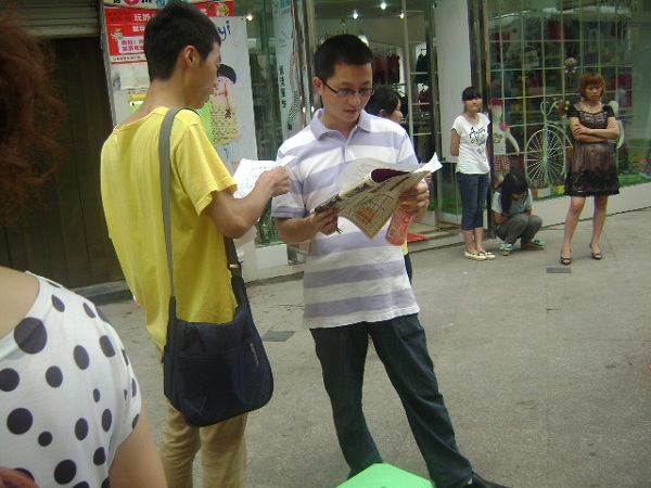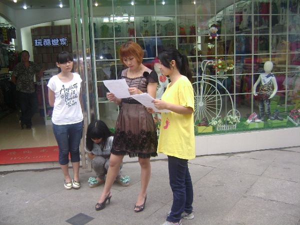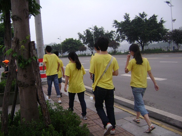 一大早,队员就在平日的集合地点等着,吃过早饭后我们就快速的赶往今天的活动地点。大家都有些奇怪,以往行进途中总是笑笑闹闹的,今天却一反常态的特别规矩。到达目的地,约定好中午的集合地点之后我们开始分散行动,两个队员一组,分别负责宣传不同的街道,而且,还加上了调查问卷的填写。这项工作我们已经驾轻就熟了,甚至我们的宣传资料都能够倒背如流,行人匆匆,却少有人愿意伸手接我们的宣传单。