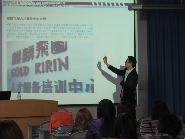 4月10日晚上7:00,麒麟飞图的赵总监及王经理在五教南201对公司图像专业的同学进行学习和就业交流。