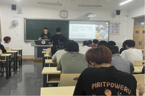 班会期间,团支书先带领同学们齐唱团歌,随后他为同学们播放了红色精神相关视频,让同学们重温难忘瞬间,感悟总书记的英雄情怀。接着,他带领同学们观看红色宣传片《一声一世》,他向同学们解释什么才叫真正的英雄,从一身正气的屈原到抗美援朝战士李延年,再到无名三十载默默奉献的黄旭华,让同学们深刻意识到英雄的意志品德是如此值得敬佩。团支书还为同学们播放了特别策划宣传片《此致!敬礼》。在观看视频的过程中团支书向同学们解读了在各个时期共产党领导中国人民所形成的伟大革命精神。对此,团支书让同学们结合实际谈谈对“爱党情怀”、“为民情怀”、“报国情怀”。同学们积极发表自己看法,思维活跃反应积极。最后,他让同学们谈谈对夏日祭的看法,同学们都提到要勿忘国耻,同学们都意识到了红色精神的重要性。