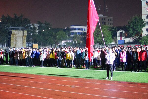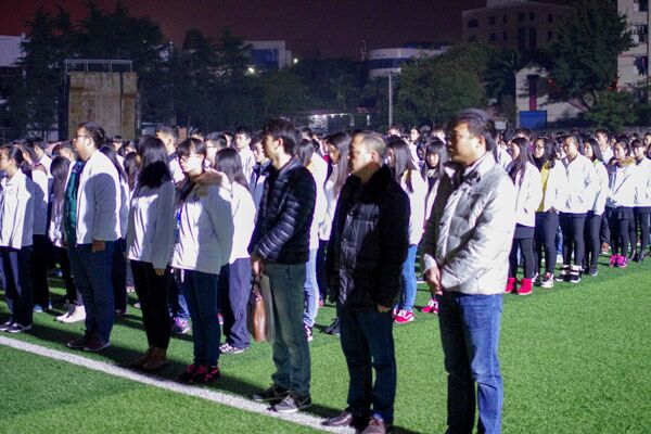伴随着慷慨激昂的解放军进行曲,国旗护卫队踏着整齐的步伐将国旗护送到升旗台,随着主持人的一声:“升国旗、奏国歌、并向国旗行注目礼”,庄严的国歌声响彻在田径场,鲜红的国旗缓缓升起,在场的每一个人都深情凝望国旗,深情地歌唱国歌。
