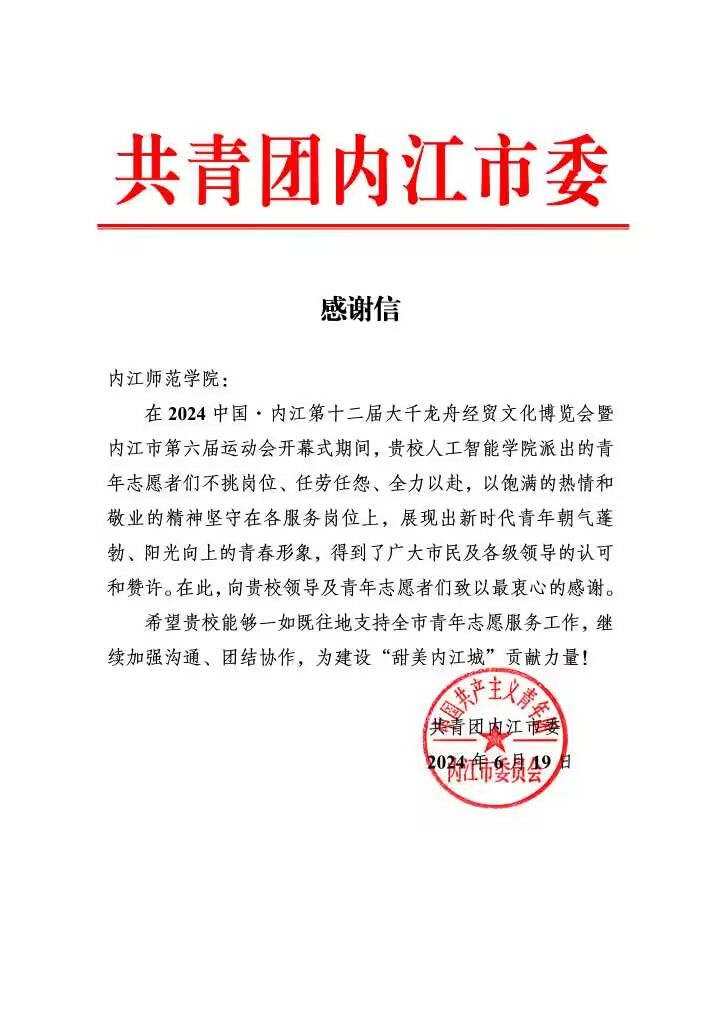 此次志愿者活动的成功开展,为2024中国·内江第十二届大千龙舟经贸文化博览会暨内江市第六届运动会的开幕式增添了浓厚的氛围和活力。活动结束后,公司收到了来自团内江市委的感谢信并呼吁广大同学能够一起参与到内江全市青年志愿者工作中来,共同建设“甜美内江城”。太阳成集团tyc33455cc的青年志愿者们用自己的实际行动诠释了“奉献、友爱、互助、进步”的志愿精神,为内江市的繁荣发展贡献了自己的青春力量。