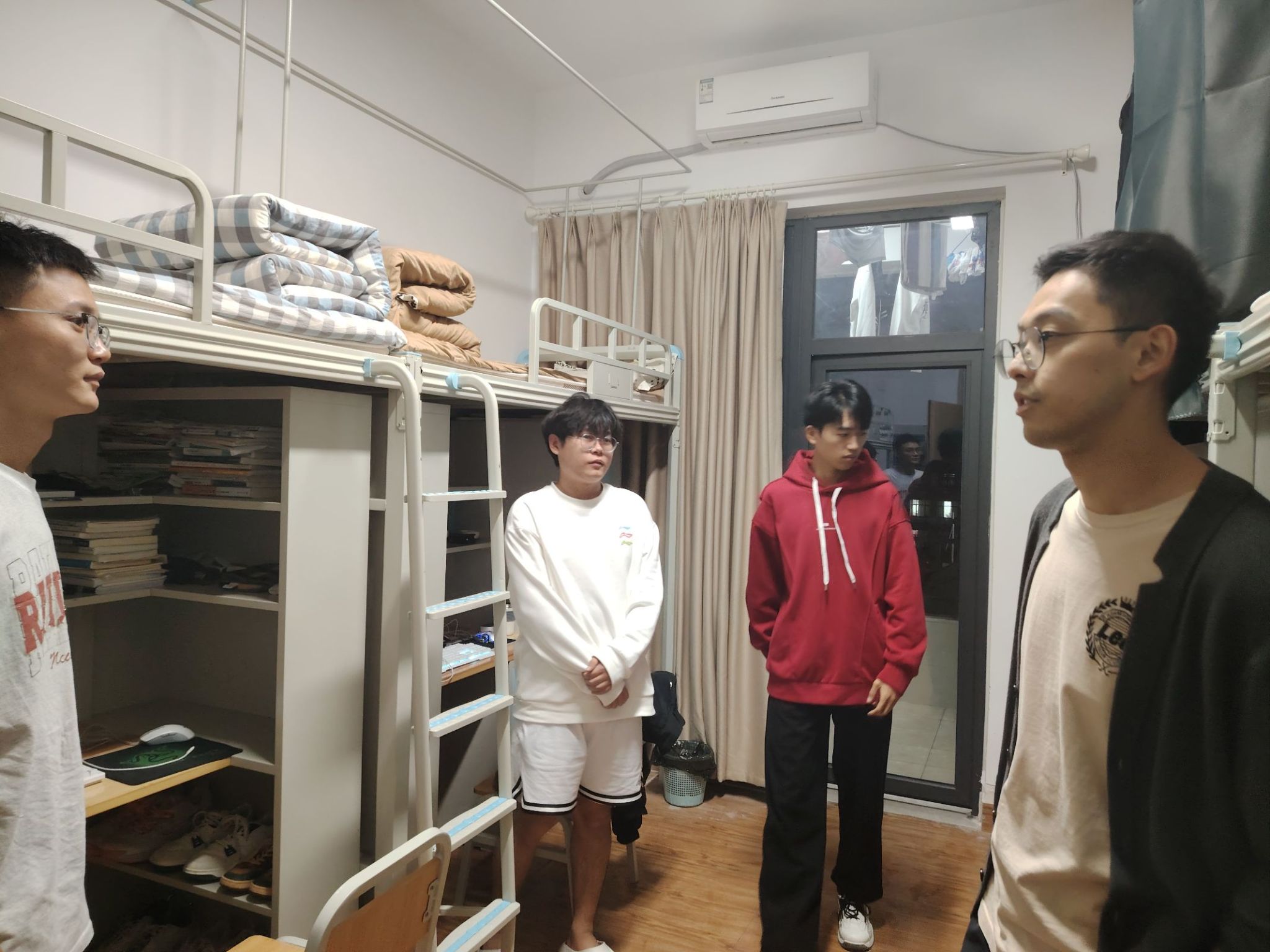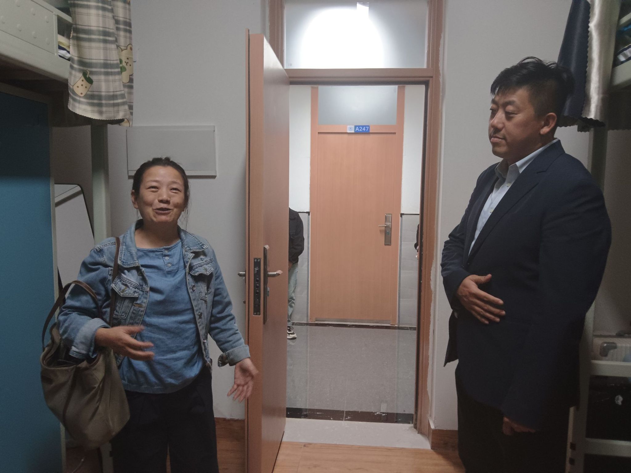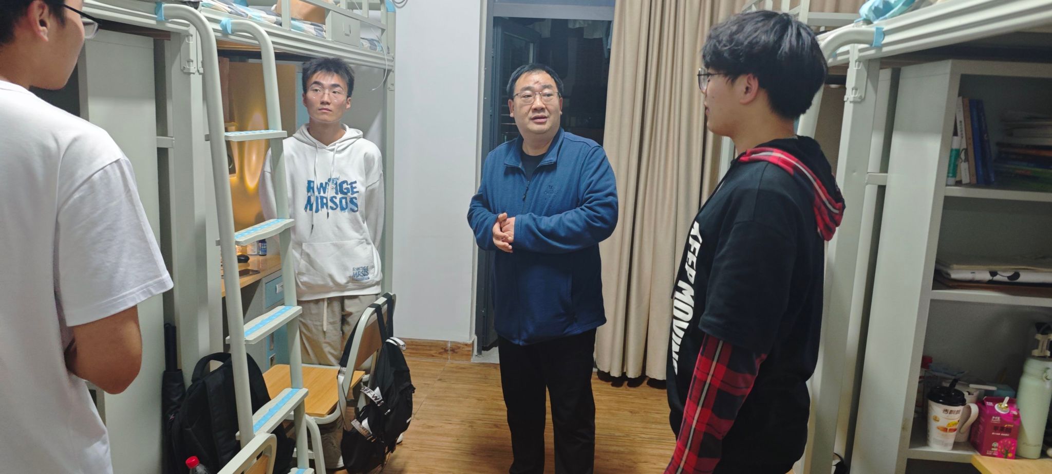 在走访看望过程中,唐书记等与员工亲切交谈,关心他们的学习状况,询问学习困难,关注生活状态和心理情况,鼓励同学们积极面对生活挑战,相互扶持共同进步。此外在宿舍的安全和卫生方面,唐书记等进行了细致检查。他们向员工们详细讲解了安全用电的重要性,提醒同学们严禁私拉乱拉电线,不使用违规大功率电器,防止用电不当引发安全事故,规范停放自行车、电动车,不占用堵塞消防通道。同时,还对消防设施进行了查看,确保灭火器等设备能够正常使用,保障同学们的生命财产安全。在卫生方面,唐书记等指出良好的宿舍卫生环境不仅有利于身体健康,还能营造积极向上的学习和生活氛围。鼓励同学们要有良好的卫生习惯,定期打扫宿舍卫生,保持宿舍整洁干净。