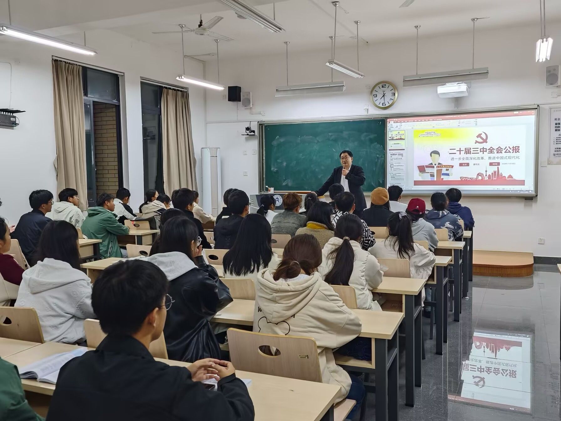 11月7日,在充满学习氛围的明德楼B311教室,唐年庆书记为2024级软件工程3班的同学们带来了一场精彩纷呈、意义非凡的讲座。此次讲座聚焦“二十届三中全会公报”,旨在帮助同学们深入理解国家改革发展的重要战略和宏伟蓝图。