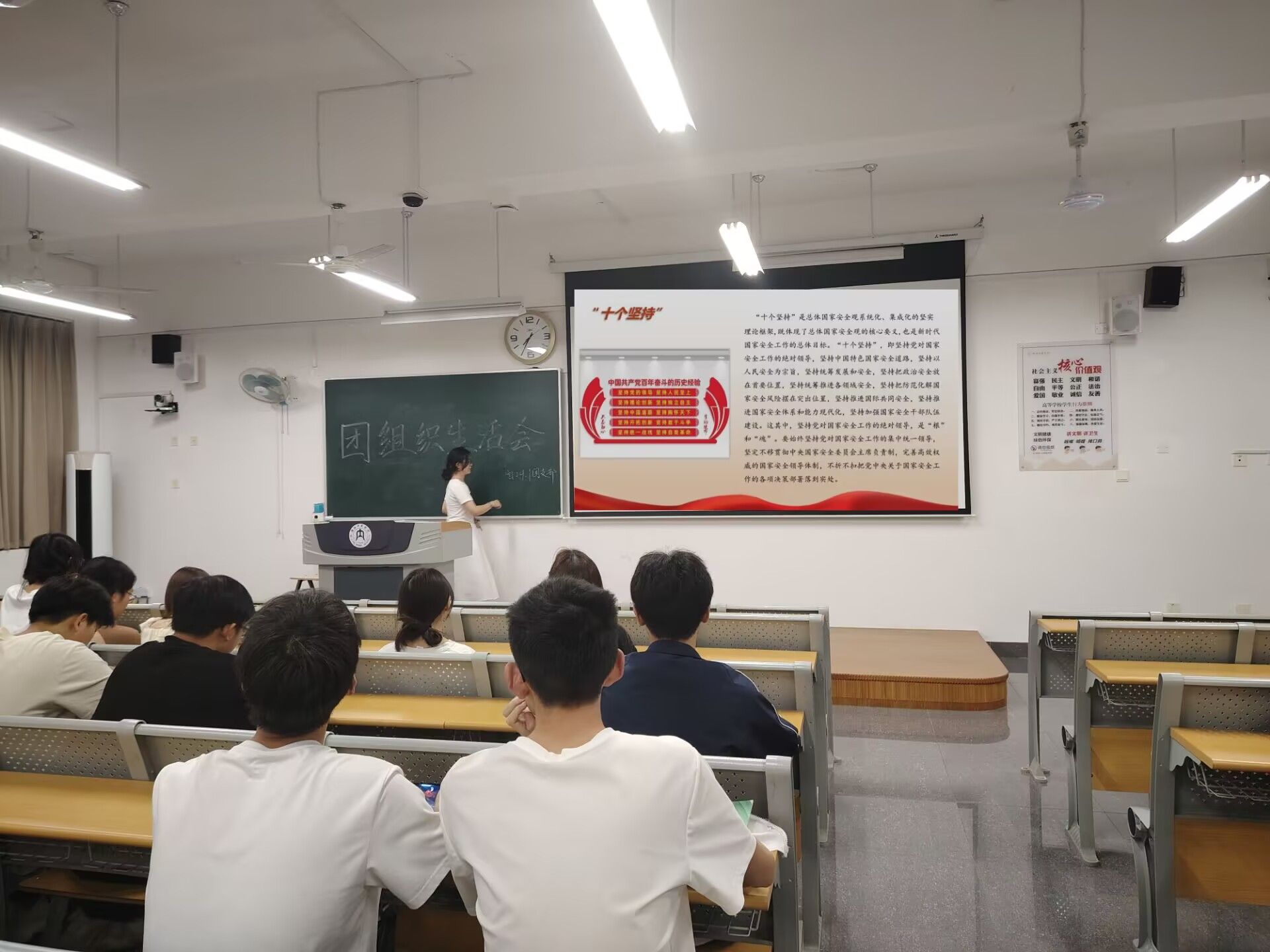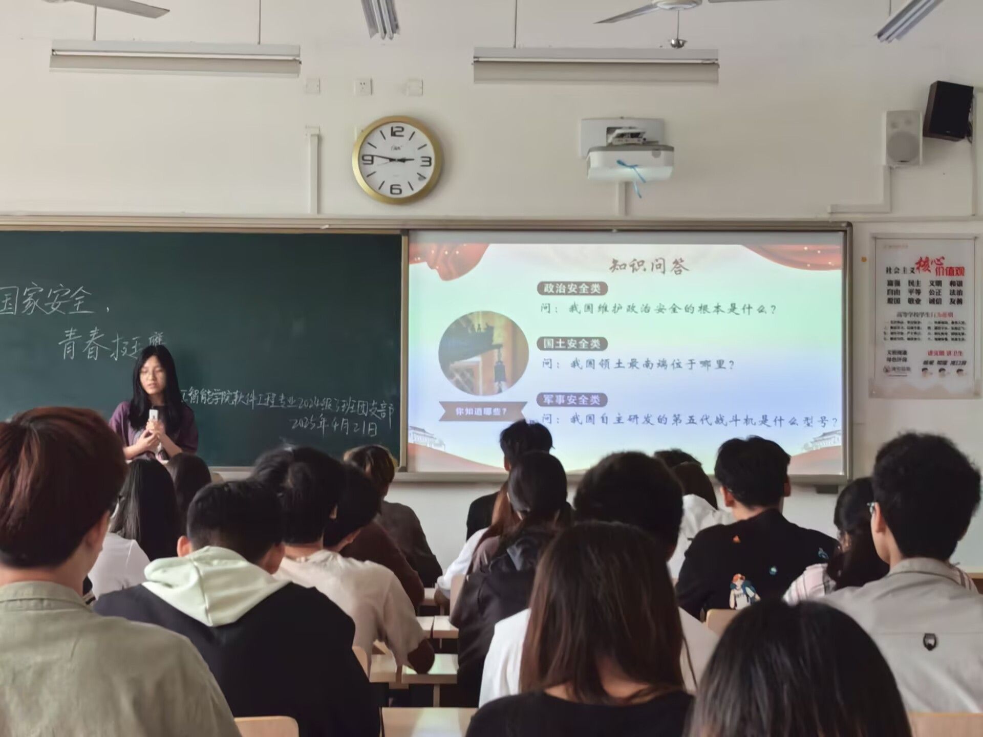 各班团支书带领同学们开展主题团会,各班结合精心制作的PPT和视频资料,向同学们讲解国家安全的内涵与外延。在团会上,同学们踊跃发言,积极回答问题,结合生活中的案例表达自己对国家安全的看法,总结团会上学习到的国家安全知识。此外,部分班级还开展了横幅签名、知识竞答等环节,丰富了团会的形式,增加了组织生活会的乐趣,让同学们对此次团会留下更加深刻的印象。