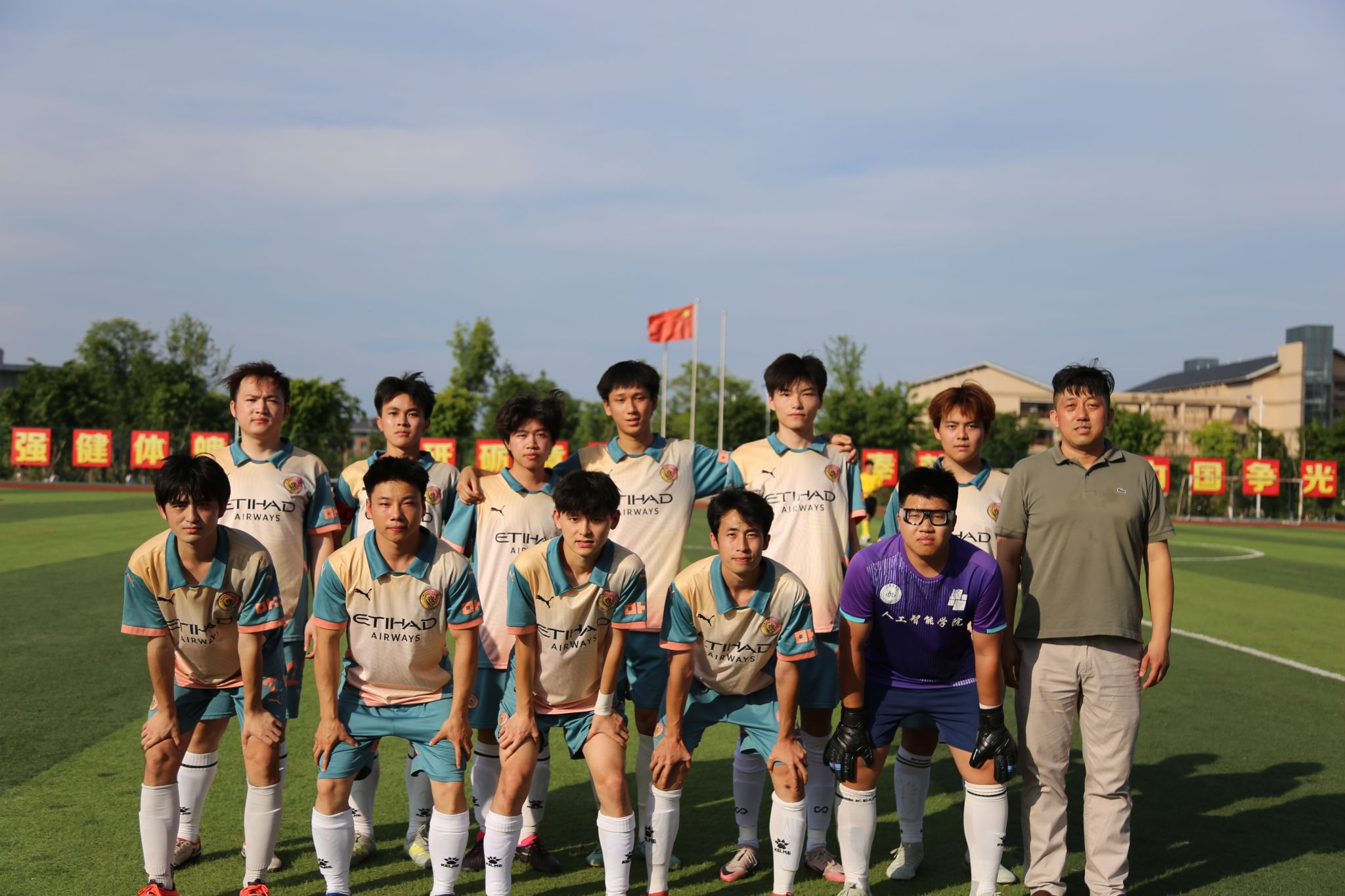 决赛开场后,双方迅速进入状态,展开了激烈的对攻。我院延续了过往顽强拼搏的作风,球员们在场上全力奔跑,积极拼抢每一个球权。上半场,我院运动健儿们凭借默契的配合和犀利的进攻,先下一城,取得 2:1 的领先。然而,物电公司并未慌乱,他们稳扎稳打,将比分反超为 2:3。虽然后半段物电公司发起猛烈反攻实现反超,但我们公司的球员们面对困境没有丝毫退缩。即便有球员腿部受伤,在简单处理后仍重返赛场,这种坚韧不拔的精神成为他们前行的动力。人工智能学院球员们延续了此前的拼搏精神,他们在球场上奋力奔跑、积极拼抢,每一次进攻和防守都充满斗志。面对实力强劲的物电公司,我们公司仍全力奋战,最终获得亚军。