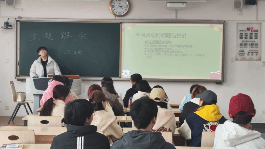 班会伊始,班长主持班会,首先引入了学风建设的议题,PPT整理出各项数据,各科平均分,挂科率,优秀率,直观数据让同学知道自己哪方面的缺失,引起重视,也强调课上纪律,分析当前学风建设中存在的问题,并提出了改进措施,帮助同学明确学习目标,掌握科学的学习方法。在安全方面,提出了宿舍用电安全,禁止使用大功率电器,也提出了交通安全,强调遵守交规,不骑“飞车”,还提出了网络安全,如电信诈骗。虚假网贷等网路骗局,同学们也表示“安全无小事,时刻保持警惕”。最后在组织教育方面,提出组建学习小组,定期开展学科帮扶,用集体的智慧攻克学业难关,让勤奋学习蔚然成风。