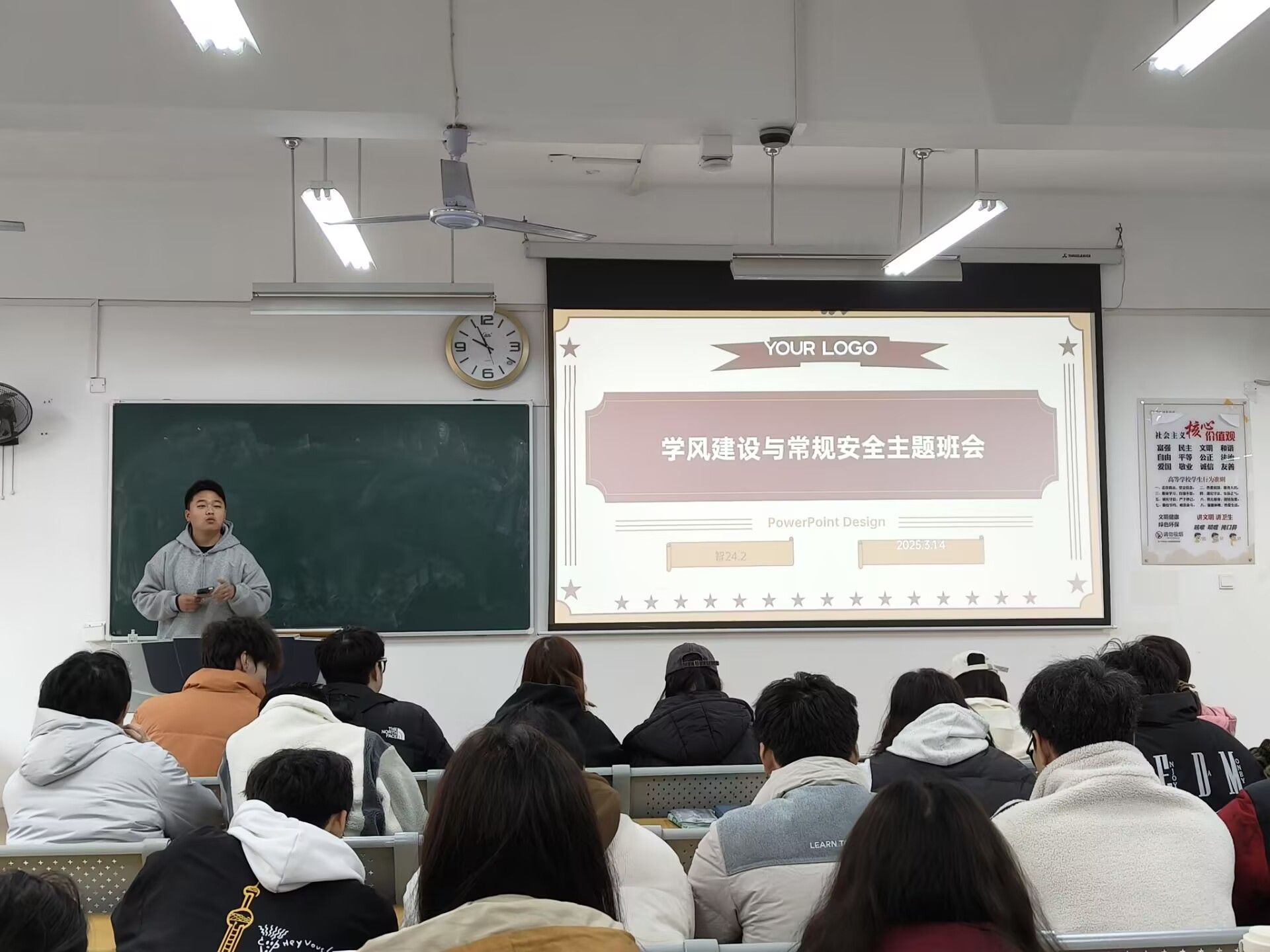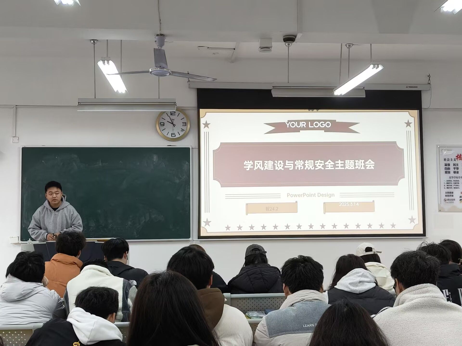 班会伊始,班长主持班会,首先引入了学风建设的议题,PPT整理出各项数据,各科平均分,挂科率,优秀率,直观数据让同学知道自己哪方面的缺失,引起重视,也强调课上纪律,分析当前学风建设中存在的问题,并提出了改进措施,帮助同学明确学习目标,掌握科学的学习方法。在安全方面,提出了宿舍用电安全,禁止使用大功率电器,也提出了交通安全,强调遵守交规,不骑“飞车”,还提出了网络安全,如电信诈骗。虚假网贷等网路骗局,同学们也表示“安全无小事,时刻保持警惕”。最后在组织教育方面,提出组建学习小组,定期开展学科帮扶,用集体的智慧攻克学业难关,让勤奋学习蔚然成风。