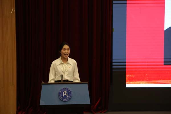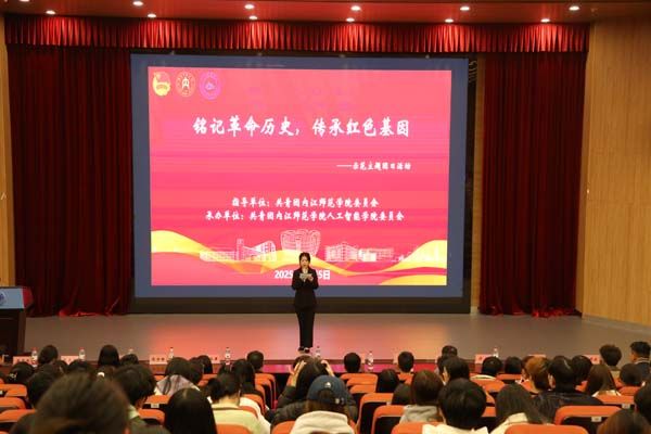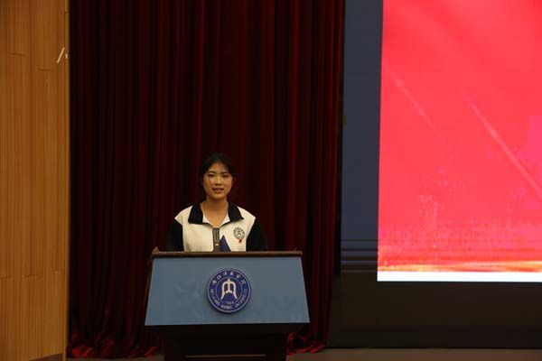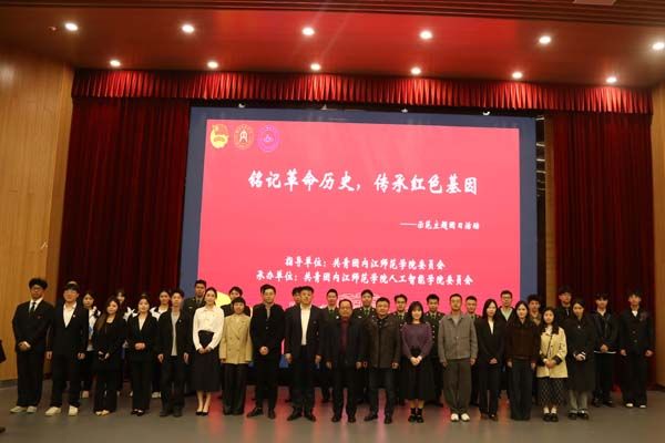 校团委副书记(员工)陈霜学同学作为公司学子代表,从抗战精神、内江红色故事、抗战与建设时期的重大贡献方面入手,强调了红色基因在新时代的力量。而新生代表银佳有同学则以两个重要的历史坐标为引,将抗战精神和抗美援朝精神的传承脉络娓娓道来。通过现场红色影片的观赏,同学们也对先辈们的英勇无畏、无私奉献纷纷表达了自己的崇高敬意。现场还开展了英雄故事分享会,由陈雅婷和鲍思语两位同学倾情讲述了抗日名将刘公台和抗日英雄周振华的英勇事迹。随后一曲高昂的《我爱你中国》将活动现场的氛围点燃,丁杨与宋昀珊两位同学以自己真挚的情感,用歌声传递着对祖国的热爱,带动了现场的同学们挥手合唱。红色知识的快问快答检验了同学们的红色知识储备,周金娜同学带来的“写给英雄的一封信”更是在纸短情长中诉说着对英雄的思念与崇敬。
