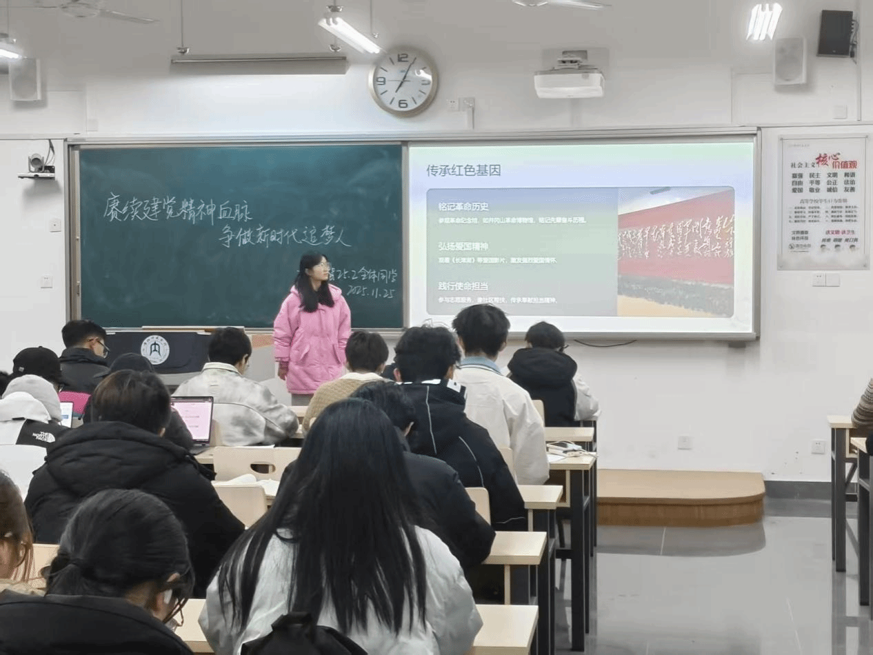 各班班会紧扣主题且形式鲜活。各班班长以红色影像资料、历史故事为切入点,结合班级日常学习、学科竞赛、志愿服务等真实经历,阐释“坚持真理、坚守理想,践行初心、担当使命,不怕牺牲、英勇斗争,对党忠诚、不负人民”的精神内涵,用身边事讲清精神内核。互动环节,学子们围绕“我的追梦宣言”交流感悟,有同学提到要以“坚持真理”的态度攻克专业难题,也有同学表示将以“不负人民”为指引参与志愿服务,现场讨论氛围热烈。各班还同步发起“赓续精神,追梦有我”倡议,明确主动学习红色知识、参与学科实践、投身志愿服务的行动方向。