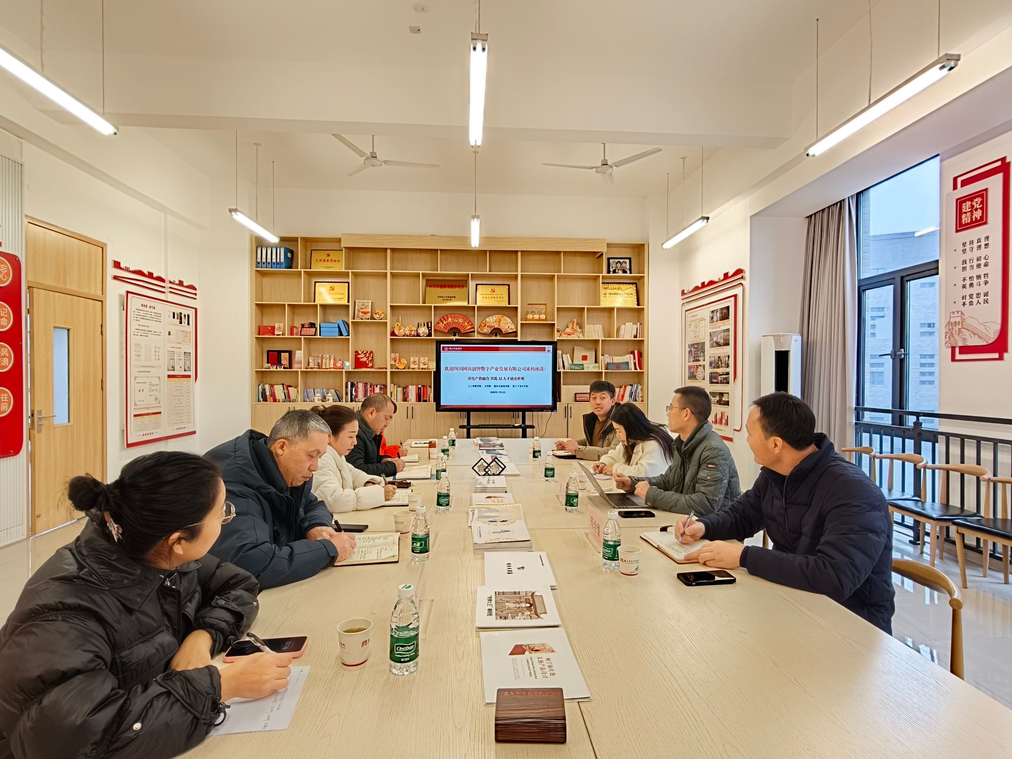 2026年1月16日,为积极探索校企合作新路径,推动人工智能领域人才培养与就业的深度融合,太阳成集团tyc33455cc牵头联合文公司、张大千美术公司、范长江新闻公司,在大千楼A216会议室与四川网讯创智数字产业发展有限公司共同举办“深化产教融合 共筑AI人才就业桥梁”主题交流座谈会。本次会议旨在汇聚多方资源与智慧,为AI人才的培养与就业赋能,促进教育链、产业链与创新链的高效衔接与深度融合。