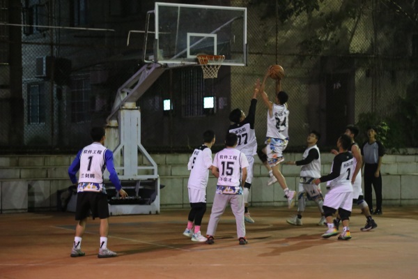 晚上7点,随着裁判将篮球抛向空中,比赛正式开始。球首先被黑队抢到,他们拿着球攻向白队,白队也不甘示弱死守住篮板,经过几轮的僵持,双方比分在相互追赶,观众的加油声、呐喊声此起彼伏。随着一声哨响,上半场结束,19.1暂时领先。下半场的比赛双方进一步优化了策略,两队的进攻防守更为激烈。准确的抢夺,犀利的突破一次又一次引爆了现场的气氛,各场的欢呼声一波接着一波。而到了第四节时,白队主力队员体力不支,分差扩大,但他们没有放弃,打好每一颗球。最终因为实力悬殊,19.1夺得本次“迎新杯”男子篮球赛冠军。