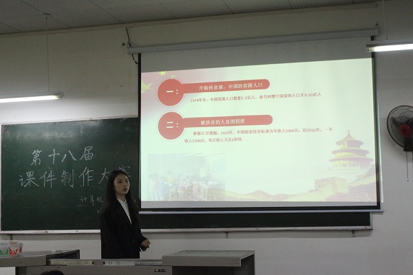 本次比赛共有三个评委老师,分别是胡晓容老师、张艳琼老师和王玉珍老师,学工办周宜蓓老师到现场观看了此次比赛。大赛共分为六个小组,每个小组由主讲人分别上去讲述他们制作的课件。所有主讲人都激情澎湃,各显神通,课件形式内容丰富,详略得当,他们都有认真负责地对待此次比赛。各位评委从制作课件内容的优良,小组成员的表现等方面对他们进行评分,最后根据分数的高低评出一等奖一名、二等奖两名和三等奖三名。