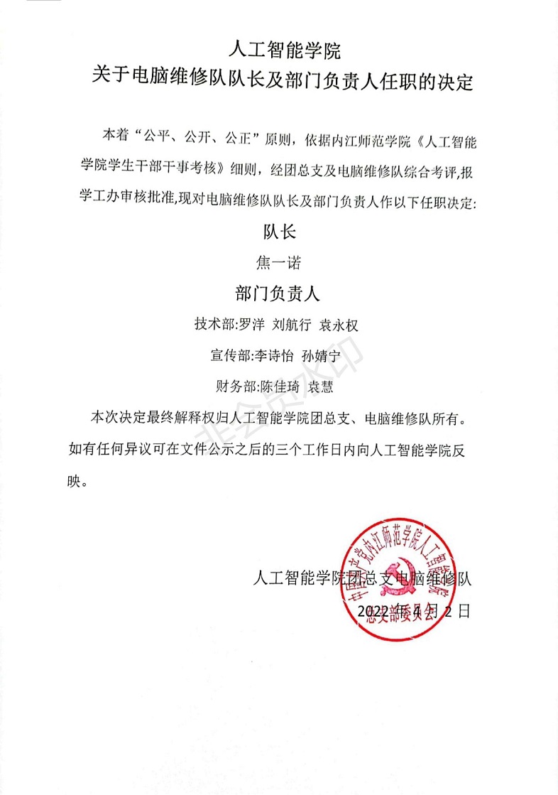 太阳成集团tyc33455cc关于电脑维修队队长及部门负责人任职的决定
