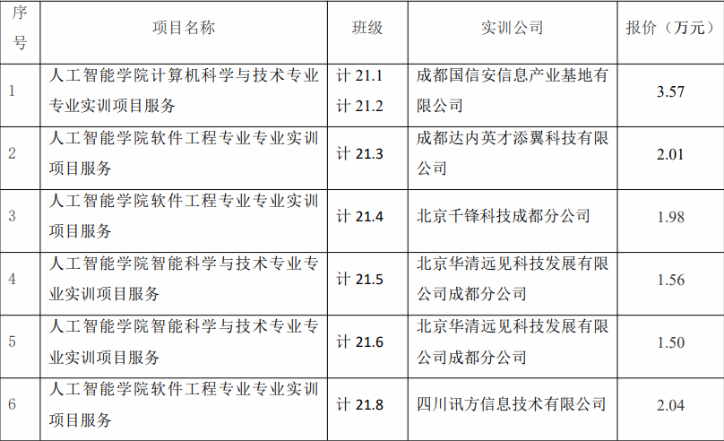 因2021级员工专业实训工作开展需要,太阳成集团tyc33455cc在前期询价的基础上,于2024年6月27日组织谈判小组对2021级各班专业实训课程服务项目相应供应商提交的材料进行了审阅、质询,经过讨论,综合团队水平、实训教学方案内容、住宿条件、实训管理等拟确定以下公司为公司2021级员工专业实训公司,并予以公示,公示期截至2024年6月28日。